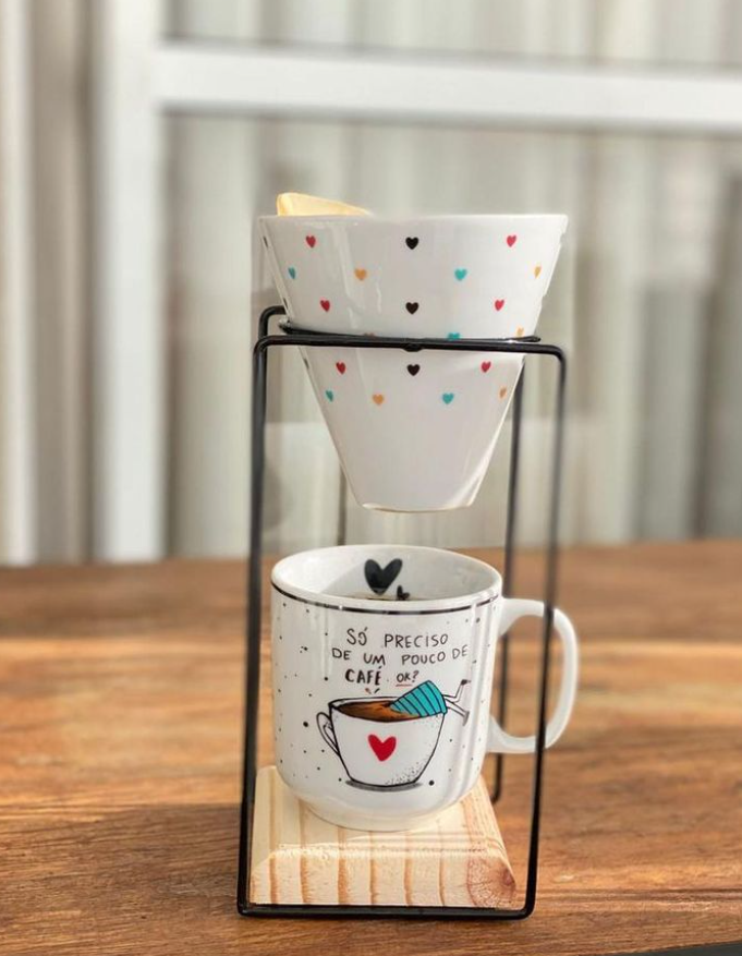 segurarnas mãos.O coadortambém em porcelana permite prepararo café com facilidade