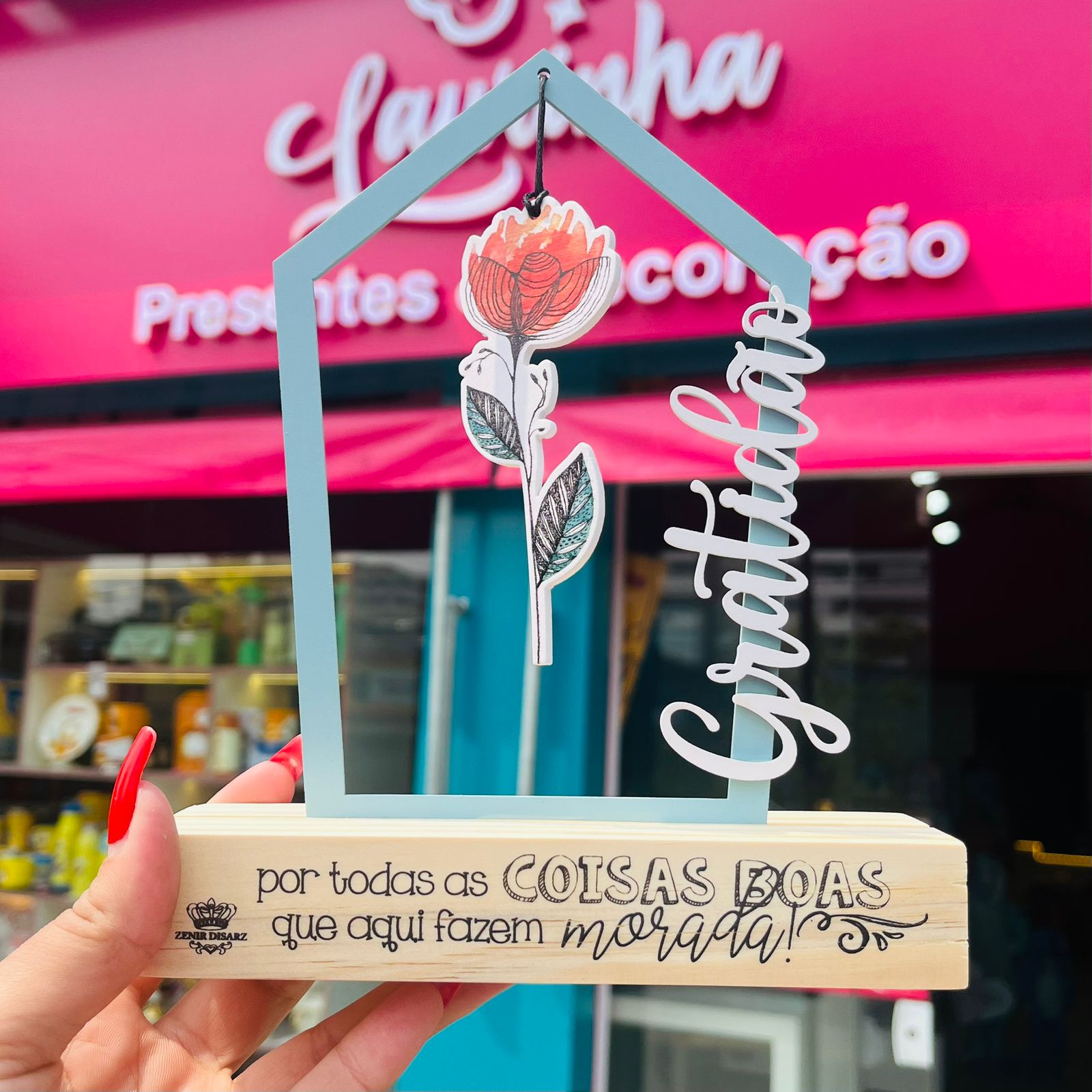 ENFEITE DE MESA CASINHA VAZADO FLOR,GRATIDÃO POR TODAS AS COISAS...JARDIM...20,5X17