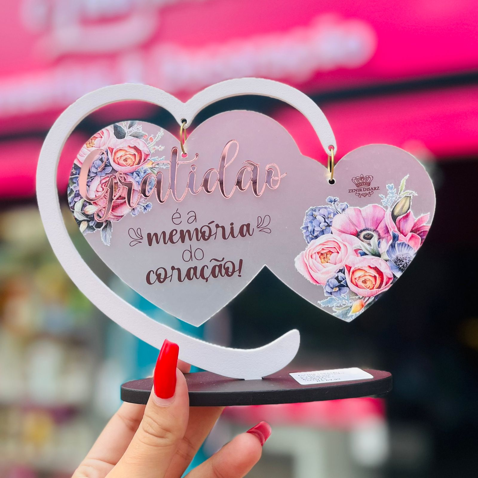 ENFEITE DE MESA COM CORAÇÃO EM ACRILICO E APLIQUE GRATIDÃO...16X18X4,5