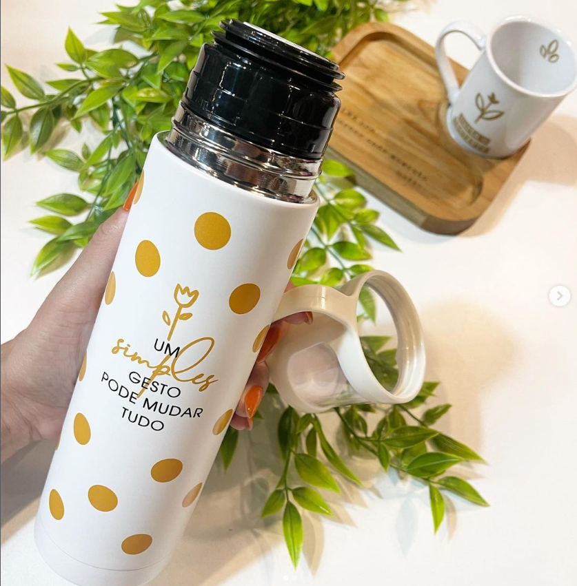 Material: Aço inoxidável, Plástico policarbonato (PC) e Silicone. Contém: 1 garrafa térmica 500ml com caneca. Dimensões: 6,8 x 25,3 x 6,8cm. Cudados: Lavar com água e sabão neutro. Não utilizar produtos químicos e abrasivos. Não levar ao micro-ondas, lava-louças ou congelador. Transportá-la na posição vertical. Evite agitá-lo.Mantém a temperatura da bebida por cerca de 6 horas, dependendo da temperatura inicial da bebida, do ambiente e se a tampa estiver fechada adequadamente. Sempre preocupados com a qualidade e a segurança, trazemos até você um produto livre de BPA (Bisfenol A). O BPA é um componente químico presente em alguns tipos de plásticos e pode causar uma série de problemas para nossa saúde quando absorvido pelo corpo. Aproveite seu produto sem preocupações!