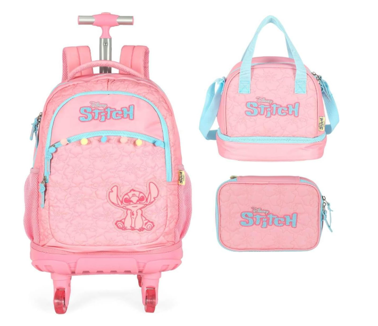 O kit é composto por três peças, mochila, estojo e lancheira. Feito com materiais de alta qualidade em poliéster, apresenta um design moderno e fofo do Stitch, o adorado personagem da Disney.